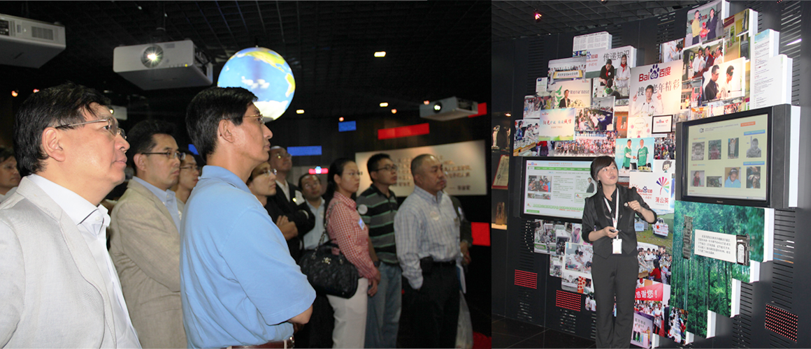 走进百度的活动是从一个神秘的圆形小屋开始,这就是百度公司的历史展览室。由一位百度的工作人员做向导,理事们一起经历了一次浓缩的百度之旅。从百度初创时确立的文化和愿景,到著名的“闪电计划”;创造了纳斯达克单日上市新股的最大涨幅纪录,到最新备受瞩目的“框计算”和百度新首页…… 百度以他的“简单可依赖”准确而朴素的定位、植根并迅速地成长。