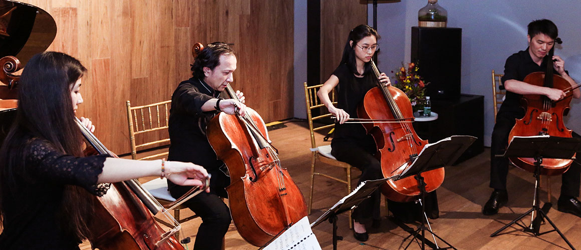 随后,朱亦兵理事领衔朱亦兵大提琴乐团的艺术家们为现场的理事及嘉宾演奏了四首经典曲目,包括:巴赫《G弦上的咏叹调》, 瓦格纳《唐豪瑟进行曲》以及爵士版的格什温《蓝色狂想曲》,最后又以婉转的中国风原创曲目《莲池赞》,将大家的思绪带入了秋夜悠远的梦境。