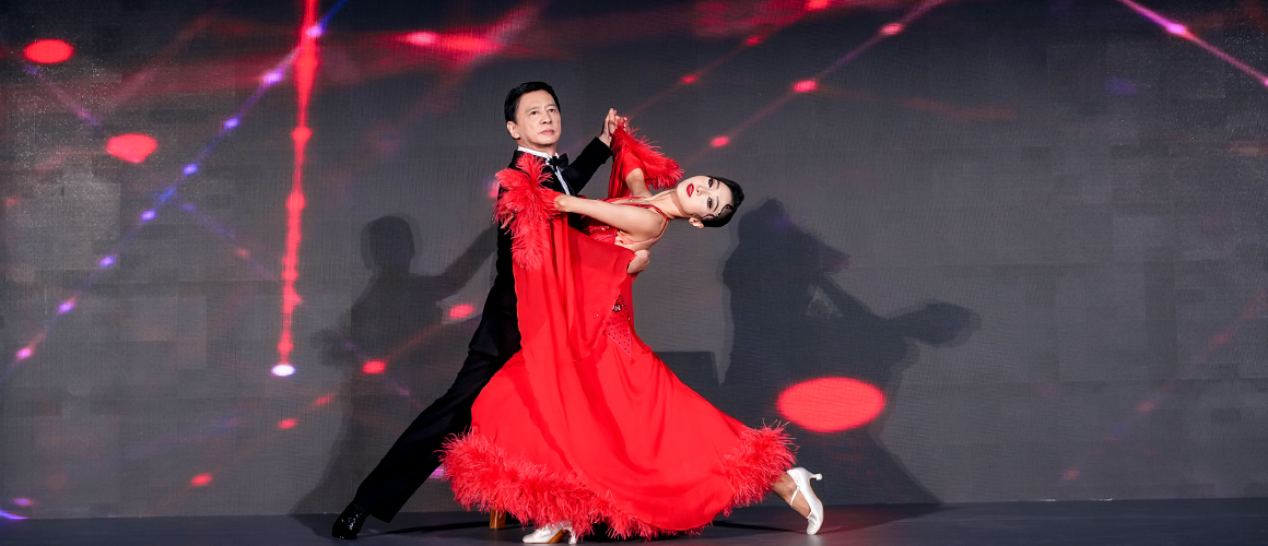 随即登台表演的是高燕定理事。高燕定老师近些年屡次登上国标舞的国际大赛重要场合,与世界各国的高手切磋舞技。这次表演的舞蹈《查尔达斯》,他曾在《世界杯国标舞环球巨星公开赛》决赛前的高光舞台上表演过。整个舞台表现华丽而流畅,理事们不禁为他的精彩舞技而频现喝彩。